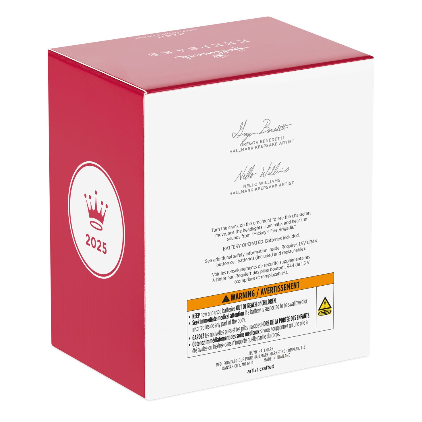 Friendship comes to the rescue this holiday season with this charming Christmas tree ornament featuring Disney Mickey Mouse and friends. The vintage-inspired design features Mickey, Donald Duck and Goofy on a fire engine ready to lend a helping hand. Turn the crank to start a light, sound and motion show inspired by the Disney animated film "Mickey's Fire Brigade." Battery operated.