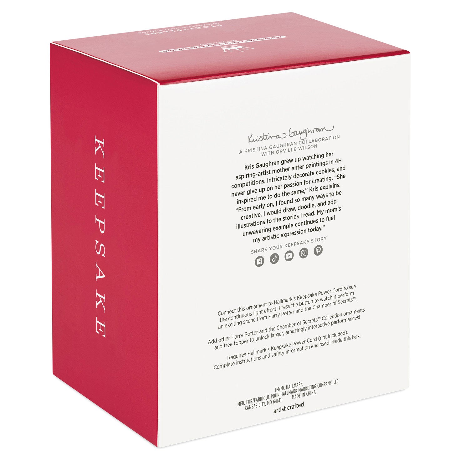 Relive the mystery and adventure that fills Harry Potter's second year at Hogwarts School of Witchcraft and Wizardry with this Christmas tree ornament. After Ron's wand is broken when he and Harry crash the Flying Car into the Whomping Willow, unfortunate—albeit often humorous—events plague Ron throughout the school year as he attempts to use the meagerly-mended tool. Plug the ornament into Hallmark's Keepsake Power Cord (sold separately) for constant illumination, then press the button to start a light and sound scene from the movie. Connect all of the Harry Potter and the Chamber of Secrets Collection Storytellers ornaments—Harry Potter, Dobby, and Ron Weasley and Hermione Granger—and the Flying Ford Anglia in the Whomping Willow Tree Topper (each sold separately) to unlock additional amazingly interactive performances. | Key Features: Connect the Storytellers Interactive Light and Sound ornament to Hallmark's Keepsake Power Cord (sold separately) to see a continuous light effect. Press the button to watch it perform a scene. Add other Harry Potter and the Chamber of Secrets Collection ornaments and tree topper to unlock larger, amazingly interactive performances. Ornament plays memorable dialogue from "Harry Potter and the Chamber of Secrets." | Additional Details: Artist-crafted by Kristina Gaughran and Orville Wilson. Plastic Christmas ornament features hanger attachment. | Includes: One Keepsake Ornament in gift box for easy gift giving, preservation and storage. Requires Hallmark's Keepsake Power Cord (sold separately). No batteries necessary. | Approx. Size in Inches: 4.37 x 5.66 x 3.54