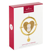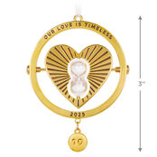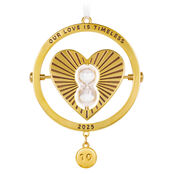 Remind a husband, wife or partner that your love stands the test of time. Perfect for commemorating a relationship or wedding anniversary, this year-dated metal Christmas tree ornament features a shiny gold circle framing a heart with an hourglass that spins. Includes a selection of round charms to personalize the decoration by displaying different anniversary years—1, 5, 10, 25, 50—or a rainbow heart charm.