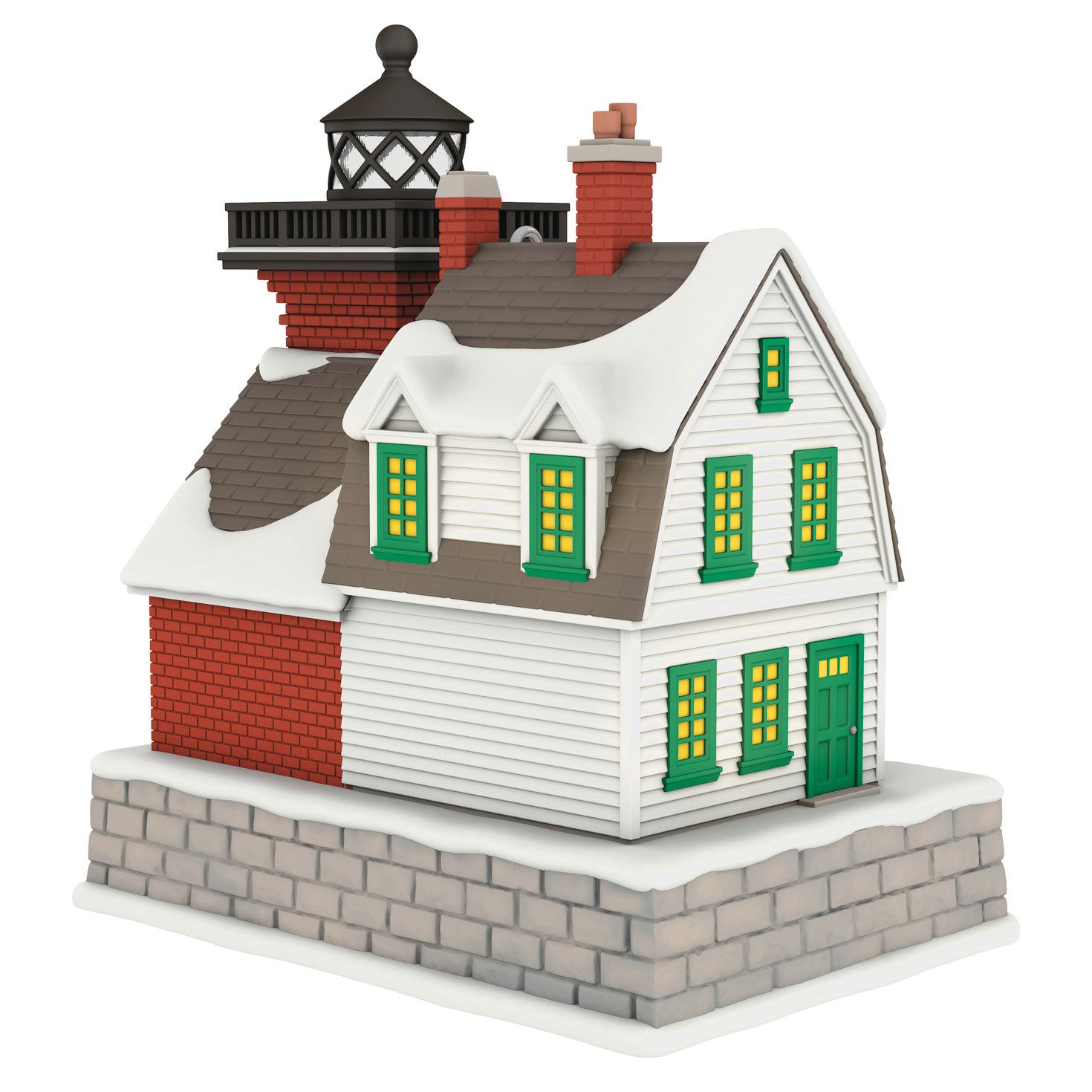 Spread holiday cheer far and near with this Christmas tree ornament that features Santa with his polar bear pal warming up by the fire and enjoying mugs of hot cocoa in front of their lighthouse home. The beacon flashes in the brick lighthouse tower, a soft glow emanates from the home's windows and the fire flickers when connected to Hallmark's Keepsake Power Cord (sold separately).