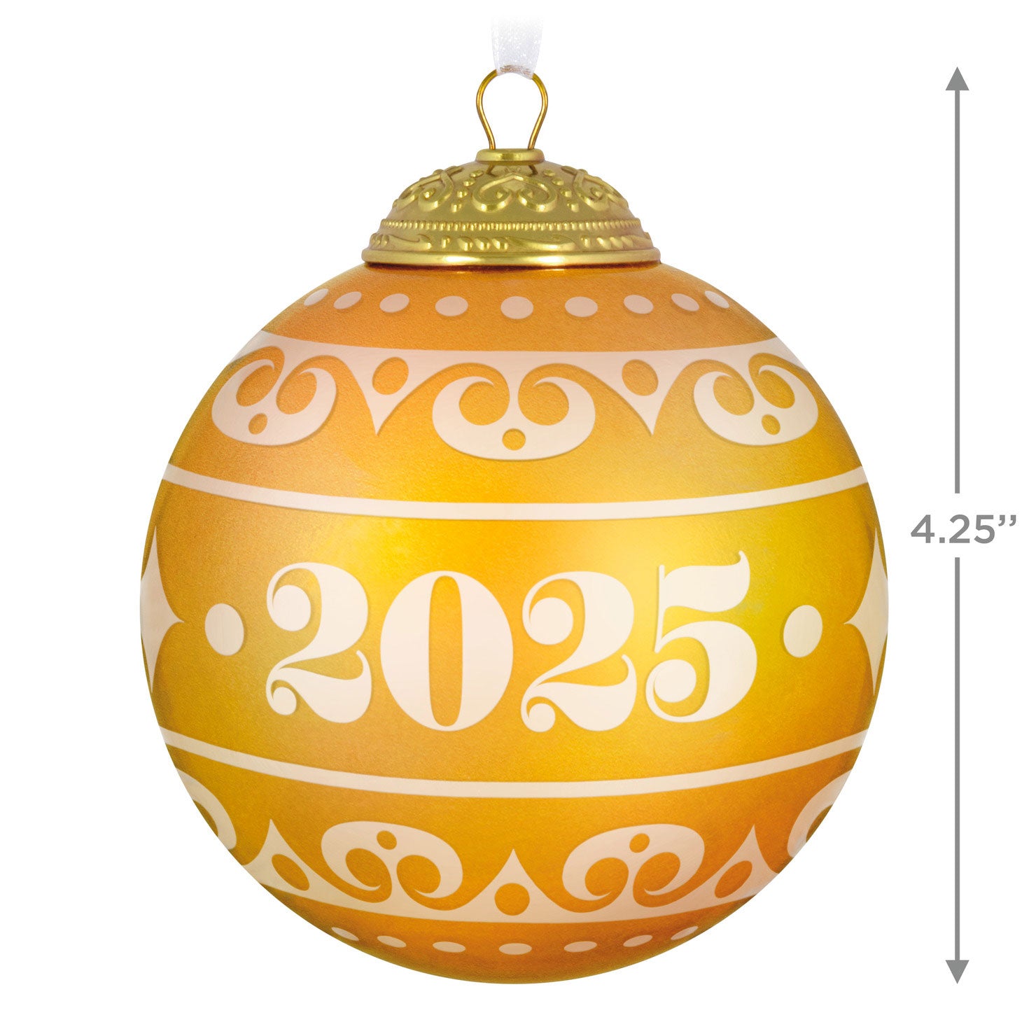 Celebrate the bright memories and happy moments that have come to you and your family this year with this commemorative 2025 Christmas tree ornament. The warm yellow glass ball features an elegant frosted glass design around the date and an embossed metal cap.