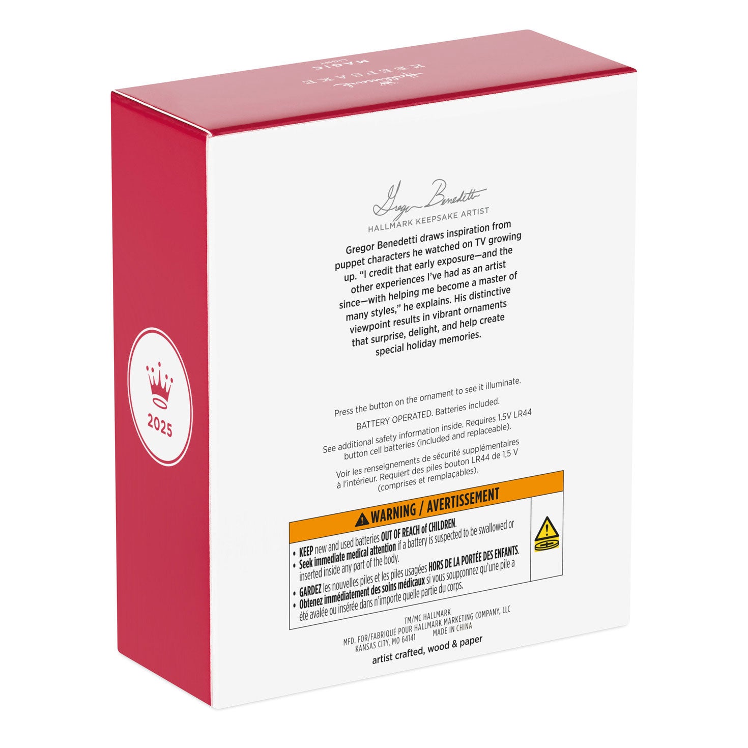 Celebrate the 85th anniversary of the beloved story of Pinocchio with this charming decoration. The heirloom-style Christmas tree ornament features a laser-cut wood frame with intricate papercraft imagery of the Blue Fairy and Geppetto's beloved puppet. A special lighting effect brings the scene to life. Makes a wonderful gift for Disney fans of all ages. Battery operated.