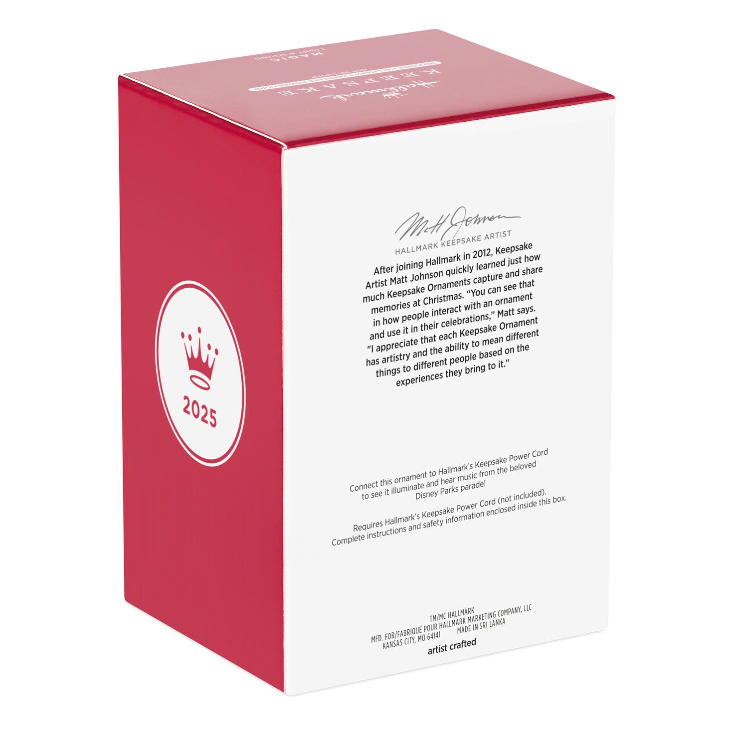 The magic of the Disney Parks doesn't stop after dark—that's when the spectacular nighttime shows come alive! This Christmas tree ornament celebrates the vibrant Main Street Electrical Parade with its colorful, twinkling lights and unforgettable song. The delightful decoration dazzles with a constant light feature when connected to Hallmark's Keepsake Power Cord (sold separately), and it performs an amazing sound and light show when you press the button.